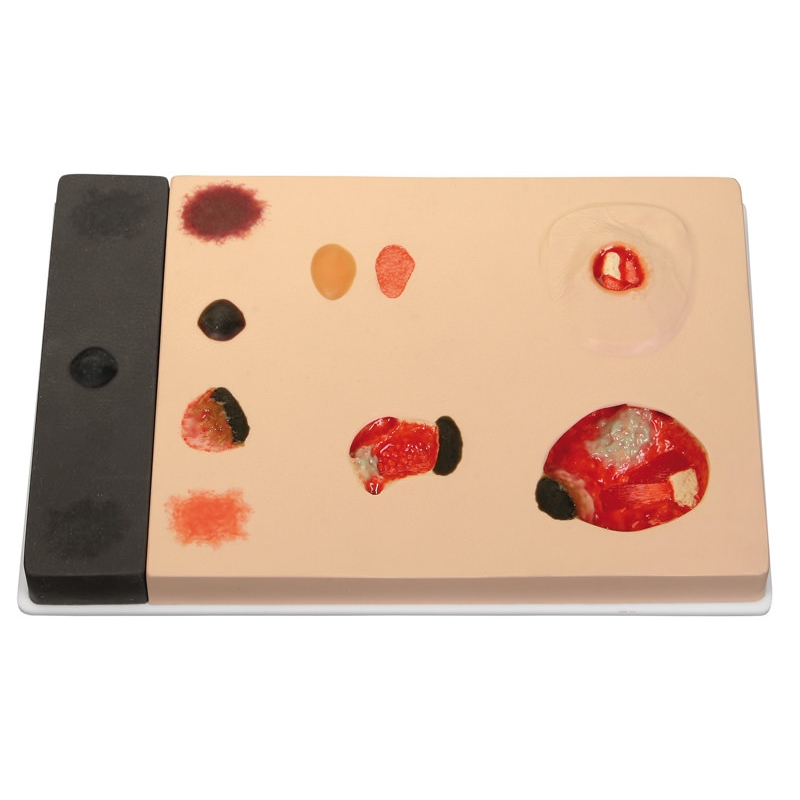 Edinstven, kompakten, celovit in realističen model, ki prikazuje naslednje poškodbe zaradi pritiska: rano brez obloge in sluzi, stopnjo 1 (na temno in svetlo pigmentirani koži), stopnjo 2, stopnjo 3 s podplutbami, tuneli in sluzjo, plitvo stopnjo 4 nad malleolusom z izpostavljeno kostjo in tetivo ter stopnjo 4 z izpostavljeno kostjo, tetivo, mišico ter podplutbami, tuneli, oblogami in sluzjo. Del temno pigmentirane kože prikazuje, kako različno je lahko videti stopnja 1, krvni mehur in sum na DTI (globoko poškodbo tkiva) glede na pigmentacijo. Na voljo je dodatna torbica za prenašanje.