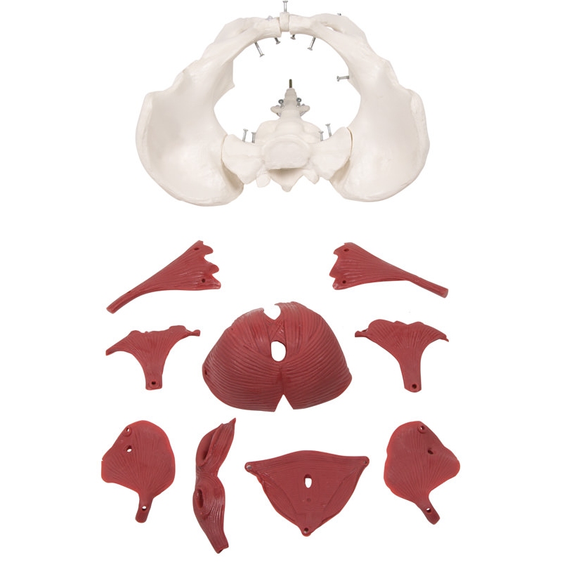 Skupaj z dvema kolčnima kostema in križnico je model sestavljen iz skupno 12 delov. Mišice so pritrjene z zatiči, kar omogoča njihovo odstranitev za prikaz plasti. Ta model je popoln za tečaje gimnastike medeničnega dna, za tečaje priprave na porod, za izobraževanje babic ali preprosto za anatomske študije medeničnega dna.
