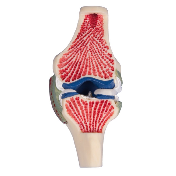Frontalni vzdolžni prerez človeškega kolenskega sklepa. Kostna struktura, meniski, sklepni hrustanec, sinovijska membrana in sklepne vezi so prikazani v barvah. Naravna velikost.