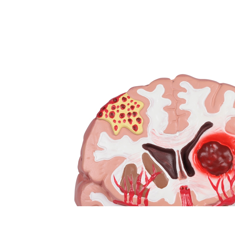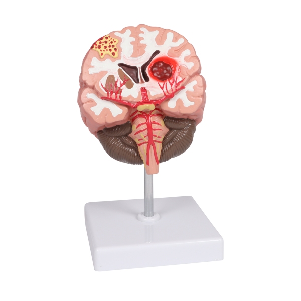 Ta model v naravni velikosti prikazuje 3 različne patologije, ki vključujejo žilni sistem možganov, vključno z arteriovenskimi malformacijami (AVM), pri katerih so krvne žile med seboj prepletene, namesto da bi tvorile normalen krog. Druga prikazana stanja vključujejo možgansko anevrizmo in cerebrovaskularno hemoragijo (možgansko kap).