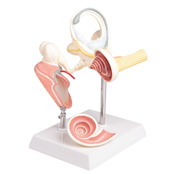 Povečano približno 15-krat. Model poučno prikazuje organe srednjega in notranjega ušesa. Prikazani so kostni in membranski labirinti, polža pa je mogoče odpreti. Na stojalu.