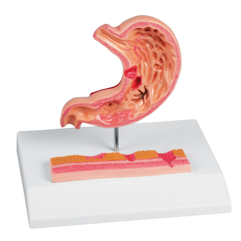 Ta zmanjšani model prikazuje različne stopnje gastritisa, od lahke razjede do perforacije. Model prereza prikazuje spodnji del požiralnika, želodec in začetek dvanajstnika. Prikazuje naslednje patologije: