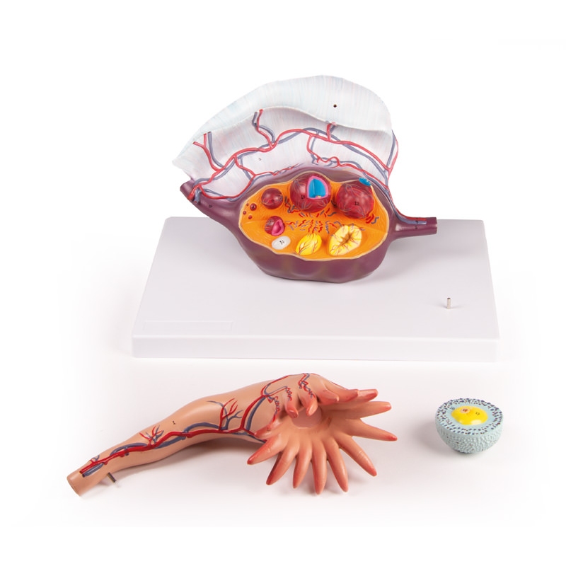 Ta dvodelni model v naravni velikosti prikazuje anatomijo človeškega jajcevoda in jajčnika. Folikli so prikazani na različnih stopnjah zorenja, od primarnega folikla do belega telesca. Primarni folikel je prerezan, da se prikaže notranja struktura. Oocit, zona pellucida in celice granuloza.