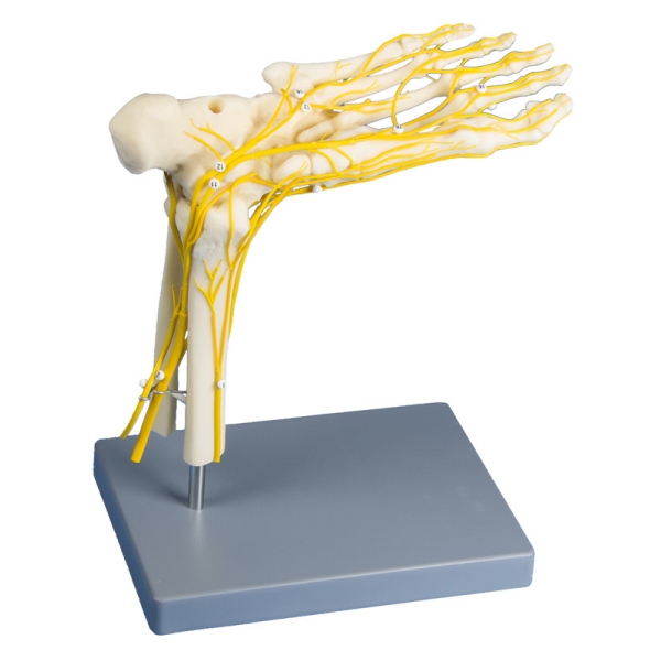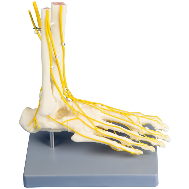 Model desnega stopala v naravni velikosti z vsemi glavnimi živci, prikazanimi na dorzalni in plantarni površini. Stopalo je mogoče odstraniti in postaviti na stojalo z glavo navzdol, da si lažje ogledate plantarno površino. Pritrjeno na stojalo s kartico za ključe.