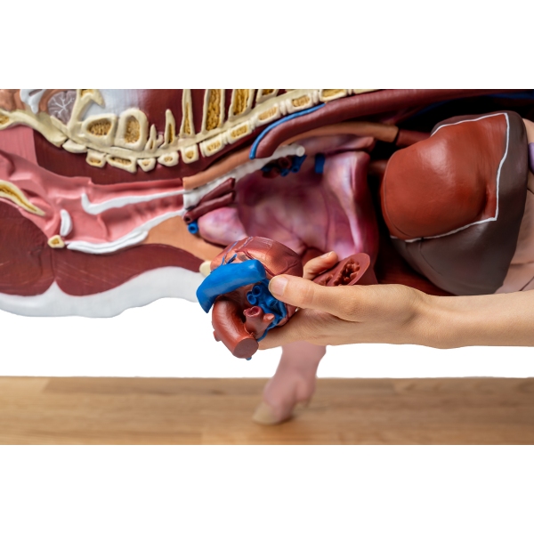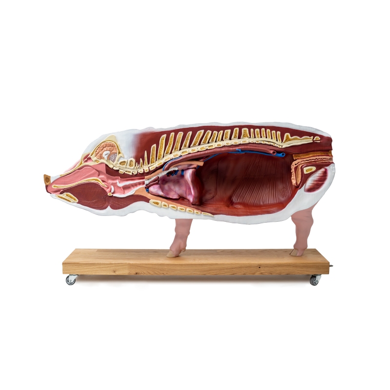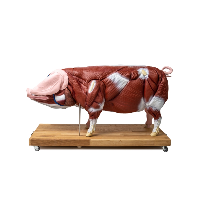 Model plemenskega prašiča (svinje), 1/2 naravne velikosti. Namenjen za poučevanje, za učence in študente. Model je nameščen na podstavku s kolesi in ga je mogoče razdeliti na dva dela vzdolž sagitalne ravnine. Desni del prikazuje zunanjo kožo živali, levi del pa mišice telesa in okončin. Ko sta polovici ločeni, leva stran prikazuje prsni koš in trebušno votlino z odstranljivimi organi (pljuča, ledvica in debelo črevo), desna stran modela pa glavne krvne žile, srce, steno trebušne votline z odstranljivimi organi, vključno z želodcem, jetri, vranico, ledvicami z nadledvično žlezo, tankim črevesom in maternico. Polovico glave modela je mogoče ločiti od polovice, ki prikazuje mišice. Model je mogoče razdeliti na 20 delov.