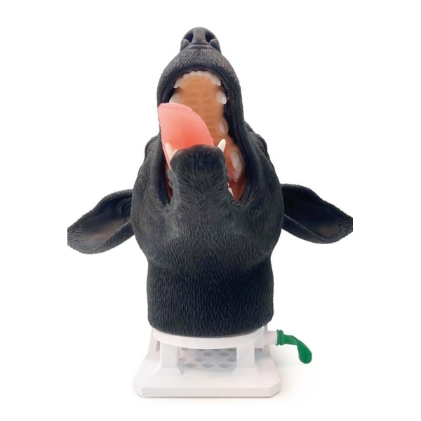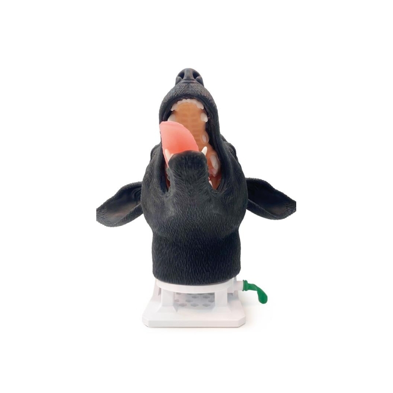 Jezik je gibljiv. Zobje so izdelani iz trde plastike, zato lahko uporabite tudi razpršilec za zobe.